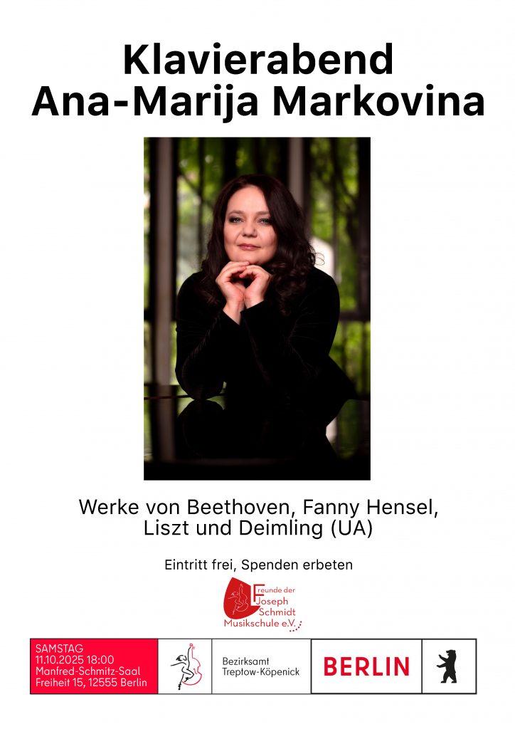 Am 11. und 12. Oktober kommt die Pianistin Ana-Marija Markovina wieder zu uns in die Musikschule und gibt für interessierte Klavierschülerinnen und Klavierschüler einen Meisterkurs am neuen Bösendorfer-Flügel im Manfred-Schmitz-Saal.